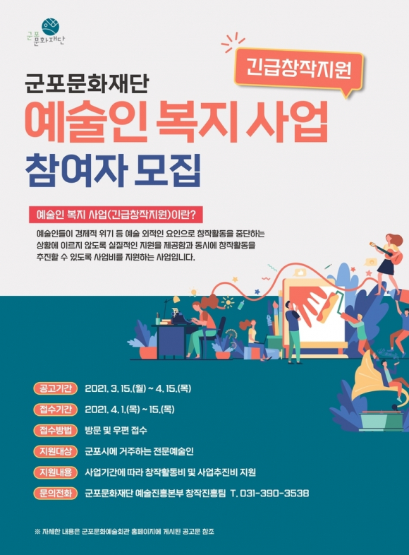 ±ºÆ÷¹®ÈÀç´ÜÀº Äڷγª19·Î âÀÛȰµ¿ Áß´Ü À§±â¿¡ ºüÁø Áö¿ª ¿¹¼úÀεéÀ» Áö¿øÇϱâ À§ÇØ »ç¾÷ºñ 5õ¸¸¿øÀ» ÅõÀÔ, ¿¹¼úÀÎ ±ä±ÞâÀÛÁö¿øÀ» ÁøÇàÇÑ´Ù°í ¹àÇû´Ù. Àç´ÜÀº À½¾Ç, ¹Ì¼ú, »çÁø, ¹®ÇÐ, °ø¿¬, ÀüÅ뿹¼ú µî ´Ù¾çÇÑ ºÐ¾ßÀÇ ¿¹¼úÀε鿡°Ô »ç¾÷º°·Î »ç¾÷±â°£¿¡ µû¶ó 300¸¸¿ø¿¡¼ ÃÖ´ë 900¸¸¿ø±îÁö Áö¿øÇÒ °èȹÀ¸·Î 4¿ù 15ÀϱîÁö Áö¿ø½Åû¼¸¦ Á¢¼ö ÁßÀÌ´Ù. ±ºÆ÷½Ã¿¡ 1³â ÀÌ»ó °ÅÁÖÇϰí ÀÖ´Â ¿¹¼úȰµ¿Áõ¸íÀ» ¿Ï·áÇÑ ¿¹¼úÀÎ Áß 2021³â 2¿ù ±âÁØ °Ç°º¸Çè·á °íÁö±Ý¾×ÀÌ ÁßÀ§ 120% À̳»À̰ųª ½ÅûÀÎÀÌ ÇǺξçÀÚ·Î½á °íÁö±Ý¾×ÀÌ 150~180% À̳»ÀÎ ¿¹¼úÀθ¸ ½ÅûÀÌ °¡´ÉÇÏ´Ù. ¶ÇÇÑ ´õ ¸¹Àº ¿¹¼úÀε鿡°Ô ÇýÅÃÀ» ÁÖ±â À§ÇØ ¿ÃÇØ ±ºÆ÷½Ã ¶Ç´Â ±ºÆ÷¹®ÈÀç´Ü¿¡¼ Áö¿ø±ÝÀ̳ª º¸Á¶±Ý »ç¾÷¿¡ ¼±Á¤µÆ°Å³ª, Çѱ¹¿¹¼úÀκ¹ÁöÀç´ÜÀÇ Ã¢ÀÛÁغñ±ÝÁö¿ø»ç¾÷¿¡ ¼±Á¤µÈ ¿¹¼úÀÎÀº ½ÅûÀÌ ºÒ°¡´ÉÇÏ´Ù. Àç´ÜÀº °¡Á¡À» Æ÷ÇÔÇÑ ÀÚ°Ý¿ä°Ç Á¡¼ö¿Í »ç¾÷°èȹ ½ÉÀǸ¦ ÅëÇØ ÃÖÁ¾ Áö¿ø´ë»óÀÚ¸¦ ÃÖ´ë 15¸í±îÁö ¼±Á¤ÇÒ ¿¹Á¤À¸·Î, Áö¿ª¹®È¿¹¼ú¹ßÀü ±â¿©µµ ¹× âÀÛȰµ¿ ÀÇÁö°¡ ³ôÀº ¿¹¼úÀÎÀ» ¿ì¼±ÀûÀ¸·Î ¼±Á¤ÇÑ´Ù´Â ¹æÄ§ÀÌ´Ù. Áö¿ø´ë»óÀ¸·Î ¼±Á¤µÇ´Â °æ¿ì, »ç¾÷±â°£¿¡ µû¸¥ »ç¾÷ÃßÁøºñ°¡ ¿ì¼± Áö±ÞµÇ¸ç, 1°³¿ù ´ÜÀ§·Î Ȱµ¿º¸°í¼¸¦ Á¦ÃâÇϰųª ÃÖÁ¾ »ç¾÷°á°ú¹°ÀÌ È®ÀεǸé âÀÛȰµ¿ºñ¸¦ Áö±Þ¹ÞÀ» ¼ö ÀÖ´Ù. Áö¿øÀ» Èñ¸ÁÇÏ´Â ¿¹¼úÀεéÀº ´ÙÀ½´Þ 15ÀϱîÁö ±ºÆ÷¹®È¿¹¼úȸ°ü ȨÆäÀÌÁö(www.gunpoart.net)¿¡¼ ½Åû¼¸¦ ³»·Á¹Þ¾Æ ÀÛ¼ºÇÑ ÈÄ, »ç¾÷°èȹ¼¸¦ ºñ·ÔÇÑ ¼·ù¸¦ ±¸ºñÇØ ±ºÆ÷¹®È¿¹¼úȸ°ü¿¡ ¹æ¹® ¶Ç´Â ¿ìÆíÀ» ÅëÇØ Á¦ÃâÇÏ¸é µÈ´Ù. À̹ø ±ä±ÞâÀÛÁö¿ø»ç¾÷°ú °ü·ÃÇÑ ÀÚ¼¼ÇÑ »çÇ×Àº ±ºÆ÷¹®È¿¹¼úȸ°ü ȨÆäÀÌÁö¸¦ Âü°íÇϰųª ÀüÈ(390-3538)·Î ¹®ÀÇÇÏ¸é ¾Ë ¼ö ÀÖ´Ù. |