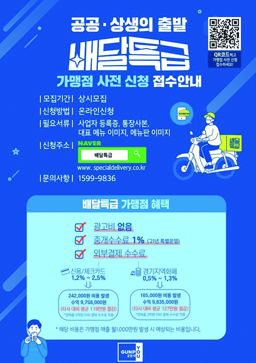 ±ºÆ÷½Ã´Â 5¿ù 3ÀÏ ¡®¹è´ÞƯ±Þ¡¯ÀÌ 7¿ùºÎÅÍ Á¤½Ä ¿î¿µ¿¡ µé¾î°£´Ù¸ç, À̸¦ À§ÇØ ¿Ü½Ä¾÷ ¼Ò»ó°øÀÎ 2,200°³¼Ò¸¦ ´ë»óÀ¸·Î °¡ÀÔ ¾È³»¿Í °¡¸ÍÁ¡ ¸ðÁý ¹× ÀÌ¿ëÀÚ È°¼ºÈ¸¦ À§ÇÑ ¿Â¡¤¿ÀÇÁ¶óÀÎ È«º¸ µîÀ» ½Ç½ÃÇÑ´Ù°í ¹àÇû´Ù. °¡¸ÍÁ¡À» ¿øÇÏ´Â Á¡Æ÷´Â ¡®¹è´ÞƯ±Þ¡¯ ȨÆäÀÌÁö¿¡¼ »ç¾÷ÀÚµî·ÏÁõ°ú ÅëÀå»çº», ´ëÇ¥¸Þ´º À̹ÌÁö, ¸Þ´ºÆÇ À̹ÌÁö µîÀ» Á¦ÃâÇØ ½ÅÃ»ÇØ¾ß Çϸç, 4¿ù ¸» ÇöÀç 86°³ ¾÷¼Ò°¡ ½ÅûÀ» ¿Ï·áÇÑ »óÅ´Ù. ¡®¹è´ÞƯ±Þ¡¯Áö¿ø ÇýÅÃÀ¸·Î´Â °¡¸ÍÁ¡Àº Áß°³¼ö¼ö·á 1%, °áÁ¦¼ö¼ö·á 1.2% ~ 2.5% µî ±âÁ¸ ¹è´Þ¾Û¿¡ ºñÇØ Àú·ÅÇÑ ¼ö¼ö·á°¡ Àû¿ëµÇ¸ç, ¼ÒºñÀÚÀÇ °æ¿ì °¢Á¾ À̺¥Æ® ÇÒÀÎ ¹× Áö¿ªÈÆó °áÁ¦ ½Ã ÇÒÀÎ ÇýÅÃÀ» ¹ÞÀ» ¼ö ÀÖ´Ù. ÀÚ¼¼ÇÑ ³»¿ëÀº ±ºÆ÷½Ã Áö¿ª°æÁ¦°ú(031-390-0281)·Î ¹®ÀÇÇÏ¸é ¾È³»¹ÞÀ» ¼ö ÀÖ´Ù. ÇÑ´ëÈñ ½ÃÀåÀº ¡°¼Ò»ó°øÀÎÀÇ ÆÇ·ÎÁö¿øÀ» À§ÇÑ °æ±âµµ °ø°ø¹è´Þ¾Û ¡®¹è´ÞƯ±Þ¡¯Àº ¼Ò»ó°øÀο¡°Ô´Â ¼ö¼ö·á ºÎ´ãÀ» ´ú¾îÁÖ°í ¼ÒºñÀÚ¿¡°Ô´Â ÇÒÀÎ ÇýÅÃÀ» Á༠Æ÷½ºÆ® Äڷγª19 ½Ã´ë¿¡ ºñ´ë¸é »ê¾÷À°¼º ¹× ¼Ò»ó°øÀÎÀÇ ÀÚ»ý·Â °È µî Áö¿ª°æÁ¦ Ȱ¼ºÈ¿¡ µµ¿òÀÌ µÉ °ÍÀ¸·Î ±â´ëÇÑ´Ù.¡±°í ¸»Çß´Ù. |