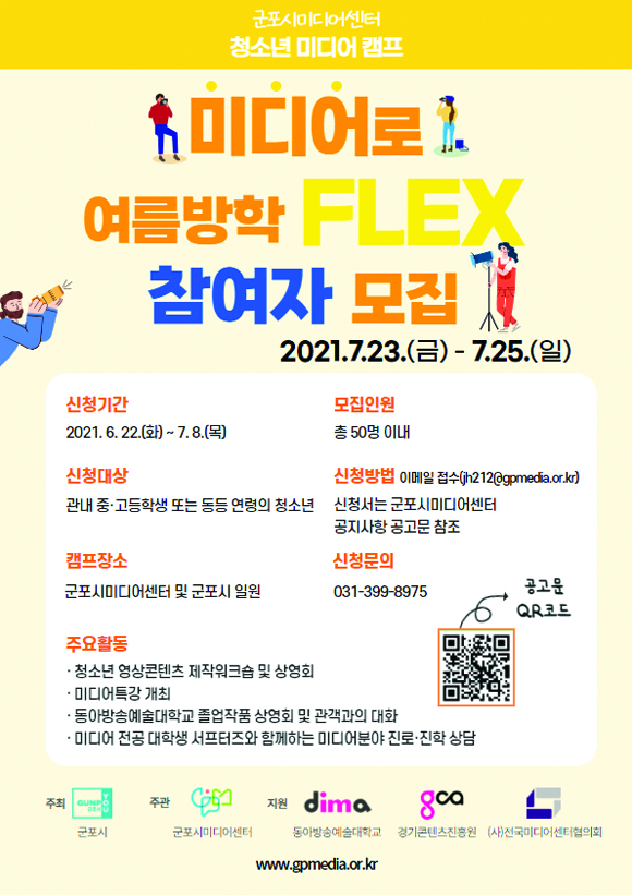 ±ºÆ÷½Ã¹Ìµð¾î¼¾ÅÍ´Â µ¿¾Æ¹æ¼Û¿¹¼ú´ëÇб³¿Í ÇÔ²² ¡®2021 ±ºÆ÷½Ã¹Ìµð¾î¼¾ÅÍ Ã»¼Ò³â ¹Ìµð¾îÄ·ÇÁ - ¹Ìµð¾î·Î ¿©¸§¹æÇÐ Ç÷º½º¡¯¿¡ Âü¿©ÇÒ Ã»¼Ò³âÀ» ¸ðÁýÇÑ´Ù°í ¹àÇû´Ù. û¼Ò³â ¹Ìµð¾î Ä·ÇÁ´Â 7¿ù 23ÀϺÎÅÍ 7¿ù 25ÀϱîÁö ±ºÆ÷½Ã¹Ìµð¾î¼¾ÅÍ ¹× ±ºÆ÷½Ã ÀÏ¿ø¿¡¼ ÁøÇàµÈ´Ù. À̹ø Ä·ÇÁ¿¡´Â À¯Æ©ºê, ƽÅå µî ¹Ìµð¾î¿¡ ´ëÇÑ °ü½É°ú Èï¹Ì°¡ ³ôÀº °ü³» Áß¡¤°íµîÇб³ û¼Ò³âµéÀÌ µ¿¾Æ¹æ¼Û¿¹¼ú´ëÇб³, Çѱ¹¿¹¼úÁ¾ÇÕÇб³ µî ¹Ìµð¾î¡¤¹æ¼Û¡¤¿µÈ °ü·Ã Àü°ø»ýµé·Î ±¸¼ºµÈ ´ëÇлý ¼Æ÷ÅÍÁîµé°ú ÇÔ²², ¿µ»óÁ¦ÀÛ È°µ¿À» ÇÏ¸é¼ Áø·Î¡¤ÁøÇп¡ ´ëÇÑ °í¹ÎÀ» ³ª´ ¼ö ÀÖµµ·Ï ±âȹµÆ´Ù. û¼Ò³â ¹Ìµð¾îÄ·ÇÁ Âü¿©ÀÚ ¸ðÁýÀº 7¿ù 8ÀϱîÁöÀ̸ç, Âü¿© ½ÅûÀº °ü³» Áß¡¤°íµîÇб³ ¶Ç´Â û¼Ò³â°ü·Ã ±â°ü(¹æ¼Û¹Ý, ¿µ»óÁ¦ÀÛ µ¿¾Æ¸® µî)¿¡¼ Ãßõ¹Þ°Å³ª, ±ºÆ÷½Ã¹Ìµð¾î¼¾ÅÍ È¨ÆäÀÌÁö(www.gpmedia.or.kr) °øÁö»çÇ׿¡¼ ½Åû¼¸¦ ³»·Á¹Þ¾Æ °³º°ÀûÀ¸·Î ½ÅûÇÒ ¼ö ÀÖ´Ù. Ä·ÇÁ Âü¿©Àڵ鿡°Ô´Â ¡®¹Ìµð¾îÄ·ÇÁ ¼ö·áÁõ¡¯ ¼ö¿©, ¿ì¼öȰµ¿ ¸ðµÒ ½Ã»ó, 2021³â¿¡ ÇÑÇØ ±ºÆ÷½Ã¹Ìµð¾î¼¾ÅÍ ½Ã¼³ ¹× Àåºñ Áö¿ø°ú ¼¾ÅÍ¿¡¼ ÁøÇàÇÏ´Â ±³À° ÇÁ·Î±×·¥ÀÇ ¿ì¼± ¼±¹ß µî ´Ù¾çÇÑ ÇýÅÃÀÌ ÁÖ¾îÁø´Ù. ÀÚ¼¼ÇÑ ³»¿ëÀº ±ºÆ÷½Ã¹Ìµð¾î¼¾ÅÍ(031-399-8975)·Î ¹®ÀÇÇÏ¸é ¾È³»¹ÞÀ» ¼ö ÀÖ´Ù. ¿øÈ¯¼· ±ºÆ÷½Ã¹Ìµð¾î¼¾ÅÍÀåÀº ¡°³»½ÇÀÖ°í ´Ù¾çÇÑ ÇÁ·Î±×·¥À» ±âÈ¹ÇØ¼ Ä·ÇÁ¿¡ Âü¿©Çϴ û¼Ò³âµéÀÌ Ä·ÇÁ±â°£ µ¿¾È Àç¹ÌÀÖ°Ô ¹Ìµð¾îȰµ¿À» °æÇèÇÏ°í ¹Ìµð¾î °ü·Ã Áø·Î¡¤ÁøÇп¡ ´ëÇØ¼µµ Èï¹Ì¸¦ °¡Áú ¼ö ÀÖµµ·Ï ¿½ÉÈ÷ ÁغñÇϰڴÙ.¡±°í ¹àÇû´Ù.