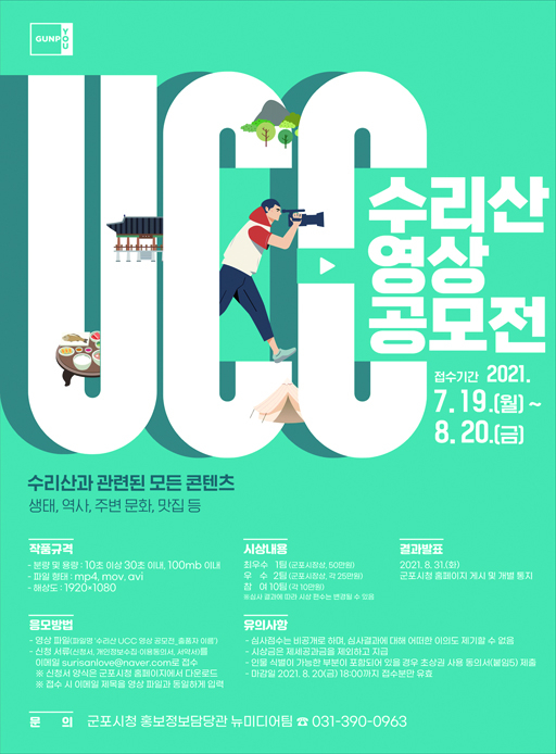 ±ºÆ÷½Ã°¡ ½ÃÀÇ ¸í»êÀÎ ¼ö¸®»êÀ» ÁÖÁ¦·Î UCC ¿µ»ó °ø¸ðÀüÀ» °³ÃÖÇÑ´Ù. °ø¸ðÀü ¼ÒÀç´Â ¿ª»ç¿Í »ýÅÂ, ÁÖº¯ ¹®È, ¸ÀÁý µî ¼ö¸®»ê°ú °ü·ÃµÈ ¸ðµç ºÐ¾ß¸¦ ¸Á¶óÇϸç, ´ëÇѹα¹ ±¹¹ÎÀÌ¸é ´©±¸³ª ÀÀ¸ðÇÒ ¼ö ÀÖ´Ù. °ø¸ð ±â°£Àº 7¿ù 19ÀϺÎÅÍ 8¿ù 20ÀÏÀ̸ç, 10ÃÊ~30ÃÊ ºÐ·®, 100mb À̳» ¿ë·®ÀÇ ¿µ»óÀ» Á¦ÀÛÇØ ½Åû¼·ù¿Í ÇÔ²² À̸ÞÀÏ(surisanlove@naver.com)·Î º¸³»¸é µÈ´Ù. À̾î âÀǼº°ú Ȱ¿ë¼º, ¿Ï¼ºµµ¸¦ ±âÁØÀ¸·Î ½É»çÇÑ ÈÄ °á°ú´Â 8¿ù 31ÀÏ ±ºÆ÷½Ãû ȨÆäÀÌÁö¿¡ °Ô½ÃÇÏ¸é¼ °³º° ÅëÁöÇÒ ¿¹Á¤ÀÌ´Ù. ÃÖ¿ì¼ö»ó(½ÃÀå»ó) 1ÆÀ¿¡ »ó±Ý 50¸¸¿ø, ¿ì¼ö»ó(½ÃÀå»ó) 2ÆÀ¿¡ »ó±Ý °¢°¢ 25¸¸¿ø, ±×¸®°í 10ÆÀ¿¡ Âü¿©»ó°ú ÇÔ²² 10¸¸¿ø¾¿ÀÇ »ó±ÝÀÌ ÁÖ¾îÁø´Ù. ½Åû¼·ù´Â ±ºÆ÷½Ãû ȨÆäÀÌÁö¿¡¼ ³»·Á¹ÞÀ¸¸é µÇ¸ç, ÀÚ¼¼ÇÑ ³»¿ëÀº ±ºÆ÷½Ãû ȨÆäÀÌÁö(¿¸°½ÃÁ¤->»õ¼Ò½Ä ÄÚ³Ê)¸¦ Âü°íÇϰųª, ±ºÆ÷½Ã ´º¹Ìµð¾îÆÀ(031-390-0963)À¸·Î ¹®ÀÇÇÏ¸é ¾È³»¹ÞÀ» ¼ö ÀÖ´Ù. ±ºÆ÷½Ã °ü°èÀÚ´Â ¡°¼ö¸®»êÀ» ¼ÒÀç·Î ÇÏ´Â ¿µ»ó °ø¸ð¸¦ ÅëÇØ ½Ã¹Î¿¡°Ô Ä£±ÙÇÑ ½Ã¹ÎÁß½ÉÀÇ ¼ö¸®»ê ÄÜÅÙÃ÷¸¦ ¹ß±¼Çؼ, ±ºÆ÷¿Í ¼ö¸®»ê È«º¸¿¡ Ȱ¿ëÇϱâ À§ÇØ ±âȹÇß´Ù¡±¸ç, ¡°¼ö¸®»êÀ» ¾Æ³¢°í ¼ö¸®»ê¿¡ °ü½ÉÀÖ´Â ºÐµéÀÇ ¸¹Àº Âü¿©¸¦ ¹Ù¶õ´Ù¡±°í ¸»Çß´Ù.