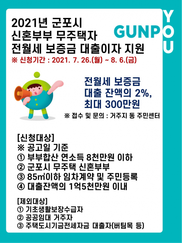 ±ºÆ÷½Ã´Â ½ÅÈ¥ºÎºÎÀÇ ÁְŸ¶·Ã ºÎ´ãÁõ°¡·Î ÀÎÇÑ È¥ÀÎÀα¸ °¨¼Ò¿Í ÀúÃâ»ê ¹®Á¦¸¦ ÇØ¼ÒÇϱâ À§ÇØ ¡®2021³â Á¦2Â÷ ½ÅÈ¥ºÎºÎ ¹«ÁÖÅÃÀÚ Àü¿ù¼¼ º¸Áõ±Ý ´ëÃâÀÌÀÚ Áö¿ø»ç¾÷¡¯À» ½Ç½ÃÇÑ´Ù. Áö¿ø´ë»óÀº °ø°íÀÏ(2021. 7. 12.) ±âÁØÀ¸·Î ¨ç ºÎºÎÇÕ»ê ¿¬¼Òµæ 8õ¸¸¿ø ÀÌÇÏÀÎ °¡±¸ ¨è ºÎºÎ ¸ðµÎ ¹«ÁÖÅÃÀÚ ¨é ½ÅûÀÏ ÇöÀç ºÎºÎ ¸ðµÎ ±ºÆ÷½Ã¿¡ Áֹεî·ÏÀ» µÎ°í, ±ºÆ÷½Ã ¼ÒÀç ÁÖ°Å¿ë ÁÖÅÃ(Àü¿ë¸éÀû 85§³ÀÌÇÏ)¿¡ ½ÅûÀÎ(¶Ç´Â ¹è¿ìÀÚ)ÀÌ ÀÓÂ÷°è¾àÀ» ü°áÇÑ °¡±¸ ¨ê ÀÓÂ÷°è¾à¼´Â ÁÖÅüÒÀ¯ÀÚ(ºÎºÎÀÇ Á÷°èÁ¸ºñ¼Ó Á¦¿Ü)¿Í ½ÅûÀÎ(¶Ç´Â ¹è¿ìÀÚ) °è¾àÀ¸·Î ÇÑÁ¤ ¨ë ´ëÃâ±ÝÀÇ Çѵµ´Â 1¾ï5õ¸¸¿ø À̳»ÀÌ´Ù. ´Ù¸¸ ±âÃÊ»ýȰº¸Àå¼ö±ÞÀÚ, °ø°øÀÓ´ë °ÅÁÖÀÚ, ÁÖÅõµ½Ã±â±Ý Àü¼¼ÀÚ±Ý ´ëÃâÀÚ(¹öÆÀ¸ñ) µîÀº Áö¿ø´ë»ó¿¡¼ Á¦¿ÜµÈ´Ù. Áö¿ø ³»¿ëÀº Àü¿ù¼¼ º¸Áõ±Ý ´ëÃâÀܾ×ÀÇ 2%¿¡ ÇÑÇØ ¿¬ 1ȸ ÃÖ´ë »ï¹é¸¸¿ø±îÁö ÀÌÀÚ Áö¿ø(1³â 1ȸ, ÃÖÀå 4³â)ÀÌ °¡´ÉÇϸç, ¸Å³â ½Åû°ú ½É»ç °úÁ¤À» °ÅÃÄ ¼±Á¤ÇÑ´Ù. Áö¿ø ÀÚ°ÝÀ» °®Ãá ½ÅÈ¥ºÎºÎ(È¥ÀαⰣ 7³â À̳»)´Â °ø°íÀÏ¿¡ ¾Õ¼ ±ÝÀ¶±â°ü ´ëÃâÀ» ¹Þ¾Æ¾ß Çϸç, ¿À´Â 7¿ù 26ºÎÅÍ 8¿ù 6ÀϱîÁö °ÅÁÖÁö µ¿ ÇàÁ¤º¹Áö¼¾ÅÍ¿¡ ½ÅÃ»ÇØ¾ß ÇÑ´Ù. ÀÚ¼¼ÇÑ »çÇ×Àº ±ºÆ÷½Ãû ȨÆäÀÌÁö ¡®°í½Ã°ø°í¡¯ °Ô½ÃÆÇ °ø°í¹®À» È®ÀÎÇϰųª, ±ºÆ÷½Ã °ÇÃà°ú Áְź¹ÁöÆÀ(¢Ï031-390-0735)À¸·Î ¹®ÀÇÇÏ¸é ¾È³»¹ÞÀ» ¼ö ÀÖ´Ù. Á¤±¸Á¤ ±ºÆ÷½Ã °ÇÃà°úÀåÀº ¡°±ºÆ÷½Ã¿¡ Á¤ÂøÇÏ·Á´Â ½ÅÈ¥ºÎºÎÀÇ Áְźñ ´ëÃâÀÌÀÚ Áö¿øÀ» ÅëÇØ ÁÖ°Å ÀÚ¸³±â¹Ý °È¿Í ¾ÈÁ¤ÀûÀÎ Á¤ÁÖ ¿©°ÇÀ» Á¶¼ºÇؼ ½ÅÈ¥ºÎºÎ°¡ Æí¾ÈÇÑ »ýȰÀ» ÇÒ ¼ö ÀÖµµ·Ï Áö¿øÇϴµ¥ ¸ñÀûÀÌ ÀÖ´Ù.¡±°í ¹àÇû´Ù |