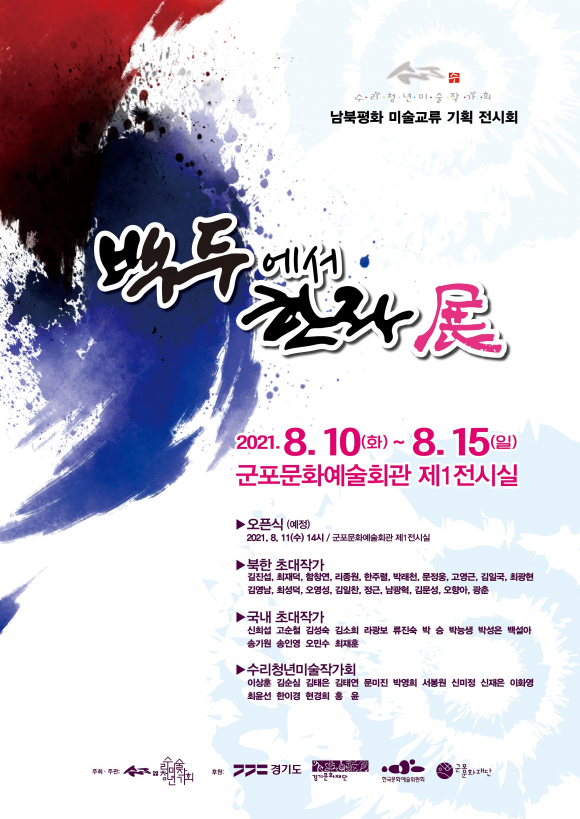 ¼ö¸®Ã»³â¹Ì¼úÀÛ°¡È¸(ȸÀå ÀÌ»óÈÆ)ÀÌ ¡¯2021 ¹éµÎ¿¡¼ ÇÑ¶ó¡® ±âȹî÷À» 8¿ù 10ÀϺÎÅÍ 15ÀϱîÁö ±ºÆ÷¹®È¿¹¼úȸ°ü 1Àü½Ã°ü¿¡¼ °³ÃÖµÇ¸ç ¿ÀÇÁ´×Àº 8¿ù 11ÀÏ ¿ÀÈÄ 2½Ã¿¡ ¿¸°´Ù. À̹ø ¡®¹éµÎ¿¡¼ ÇѶó¡¯ÀüÀº ³²ºÏÀÇ ¿µÅ並 ÀÕ´Â ¹éµÎ´ë°£°ú ¸¹Àº »ê, µéÆÇÀÇ Ç³°æÀ» ÁÖÁ¦¸¦ ÅëÇØ ¿ì¸®¹ÎÁ·ÀÌ ÇÔ²² °¡Áö°í ÀÖ´Â »öä¿Í Á¤¼¸¦ ´À²¸º¸´Â ÃëÁöÀÌ´Ù. À̰ÍÀ» ³»Æ÷Çϰí ÀÖ´Â ÀÛǰµé·Î ³²ÇѰú ºÏÇÑÀÇ ¹®È¿¹¼ú ¸¸³²ÀÇ Åë·Î¸¦ ã´Â ÀÏȯÀ¸·Î 2019³âµµ¿¡ À̾î 2021³â ¿ÃÇØµµ ³²¡¤ºÏ¹Ì¼ú 50¿© Á¡À» ÇÑ °ø°£¿¡¼ ¸¸³ª´Â ¡®2021¹éµÎ¿¡¼ ÇѶó¡¯ÀüÀ» °³ÃÖÇÏ°Ô µÇ¾ú´Ù. ºÏÇÑÃÊ´ëÀÛ°¡·Î´Â ±æÁø¼·, ÃÖÀç´ö, ÇÔ⿬, ¸®Á¾¿ø, ÇÑÁÖ·Ä, ¹Ú·¡Ãµ, ¹®Á¤¿õ, °í¿µ±Ù, ±èÀϱ¹, ÃÖ±¤Çö, ±è¿µ³², ÃÖ¼º´ö, ¿À¿µ¼º, ±èÀÏÂù, Á¤±Ù, ³²±¤Çõ, ±è¹®¼º, ¿ÀÇâ¾Æ, ±¤Ãá ÀÛ°¡´Ù. ±¹³»Âü¿©ÀÛ°¡´Â ½ÅÈñ¼·, °í¼øÃ¶, ±è¼º¼÷, ±è¼ÒÈñ, ¶ó±¤º¸, ·ùÁø¼÷, ¹Ú½Â, ¹Ú´É»ý, ¹Ú¼ºÀº, ¹é¼³¾Æ, ¼Û±â¿ø, ¼ÛÀοµ, ¿À¹Î¼ö, ÃÖÀçÈÆ ÀÛ°¡ µîÀÌ´Ù. ±ºÆ÷½Ã¿¡¼ °³ÃֵǴ ¸¸Å ±ºÆ÷½Ã ÀÛ°¡µéµµ Âü°¡Çϰí Àִµ¥ ÀÌ»óÈÆ ¼ö¸®Ã»³â¹Ì¼úÀÛ°¡È¸ÀåÀ» ºñ·ÔÇÏ¿© ±è¼ø½É, ±èÅÂÀº, ±èÅ¿¬, ¹®¹ÌÁø, ¹Ú¿µÈñ, ¼ºÀ¿ø, ½Å¹ÌÁ¤, ½ÅÀçÀº, ÀÌÈ¿µ, ÃÖÀ±¼±, ÇÑÀ̰æ, Çö°æÈñ, È«À± ÀÛ°¡µéµµ Âü¿©Çϰí ÀÖ´Ù.