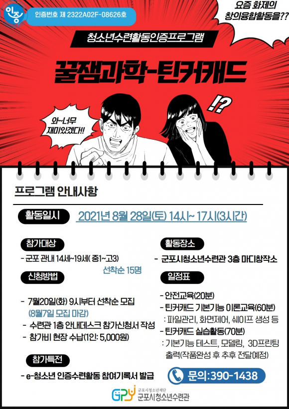 ±ºÆ÷½Ãû¼Ò³â¼ö·Ã°üÀº û¼Ò³â¼ö·Ã Ȱµ¿ ÀÎÁõÇÁ·Î±×·¥ ¡°¾î¸°ÀÌ °æÁ¦Ã¼Ç衱°ú ¡°²ÜÀë°úÇÐ-ƾĿijµå¡±¸¦ ±ºÆ÷ °ü³» û¼Ò³âµéÀ» ´ë»óÀ¸·Î ¿À´Â 8¿ù 28ÀÏ¿¡ ¿î¿µÇÑ´Ù. ¾î¸°ÀÌ °æÁ¦Ã¼ÇèÀº ÃʵîÇлýÀ» ´ë»óÀ¸·Î °æÁ¦ °ü·Ã À̷аú ½Ç½ÀÀ» Åä´ë·Î °æÁ¦ °ü³ä¿¡ ´ëÇØ ¹è¿ì´Â ÇÁ·Î±×·¥À¸·Î ÁøÇàµÇ¸ç, ²ÜÀë°úÇÐ-ƾĿijµå´Â °úÇп¡ °ü½É ÀÖ´Â Áß¡¤°íµîÇб³ û¼Ò³âÀ» ´ë»óÀ¸·Î 3DÇÁ¸°ÆÃ Ȱ¿ë¹ýÀ» ¹ÙÅÁÀ¸·Î ¸ðµ¨¸µ Ãâ·Â ½Ç½À Ȱµ¿ÀÌ ÁøÇàµÈ´Ù. û¼Ò³â¼ö·ÃȰµ¿ ÀÎÁõÁ¦´Â û¼Ò³âÀÌ ¾ÈÀüÇϰí À¯ÀÍÇÑ Ã»¼Ò³â Ȱµ¿¿¡ Âü¿© ÇÒ ¼ö ÀÖµµ·Ï ÀÏÁ¤ ±âÁØ¿¡ µû¶ó ½É»çÇÏ¿© ÇÁ·Î±×·¥À» ÀÎÁõÇÏ´Â ±¹°¡ÀÎÁõÁ¦µµÀ̸ç, º» ÇÁ·Î±×·¥¿¡ Âü¿©Çϴ û¼Ò³â¿¡°Ô´Â e-û¼Ò³â ÀÎÁõ ¼ö·Ã Ȱµ¿ Âü¿©±â·Ï¼°¡ ¹ß±ÞµÉ ¿¹Á¤ÀÌ´Ù. Âü°¡ÀÚ ¸ðÁýÀº 8¿ù 11ÀϱîÁö ¼±Âø¼øÀ¸·Î ÁøÇàµÇ¸ç, Á¢¼ö´Â ±ºÆ÷½Ãû¼Ò³â¼ö·Ã°ü ¹æ¹® ÈÄ ½ÅûÀÌ °¡´ÉÇÏ´Ù. ±âŸ»çÇ×Àº ±ºÆ÷½Ãû¼Ò³â¼ö·Ã°ü 031-390-1439·Î ¹®ÀÇÇÏ¸é µÈ´Ù. ±ºÆ÷½Ãû¼Ò³â¼ö·Ã°ü °ü°èÀÚ¿¡ µû¸£¸é ¡°Áö¿ª û¼Ò³âµéÀÇ ¿å±¸¿¡ ºÎÀÀÇÏ´Â ´Ù¾çÇÑ ¼ö·ÃȰµ¿ ÀÎÁõÇÁ·Î±×·¥À» Á¦°øÇÏ¿© °ü³» û¼Ò³âµéÀÌ ¹Ì·¡»çȸÀÇ ÁÖ¿ªÀ¸·Î ¼ºÀåÇÒ ¼ö ÀÖ°Ô Áö¿øÇÒ ¿¹Á¤ÀÌ´Ù.¡±¶ó°í ¹àÇû´Ù. |