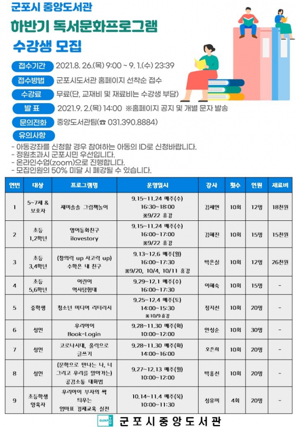 ±ºÆ÷½Ã Áß¾Óµµ¼°üÀº ¾î¸°À̺ÎÅÍ ¼ºÀο¡ À̸£±â±îÁö ¿Ã ÇϹݱ⠿¶óÀÎ µ¶¼¹®ÈÇÁ·Î±×·¥À» ¸¶·ÃÇÏ°í ¼ö°»ýÀ» ¸ðÁýÇÑ´Ù. À̹ø µ¶¼¹®ÈÇÁ·Î±×·¥Àº ¿À´Â 9¿ù 13ÀϺÎÅÍ 12¿ù 13ÀϱîÁö ¾î¸°À̺ÎÅÍ ¼ºÀÎÀ» ´ë»óÀ¸·Î ¸ðµÎ 9°³ °Á¸¦, Äڷγª19 È®»ê ¹æÁö¿Í ½Ã¹ÎµéÀÇ ¾ÈÀüÀ» À§ÇØ ºñ´ë¸é ¿Â¶óÀÎÀ¸·Î ÁøÇàÇÑ´Ù. ¼ºÀÎ ´ë»ó °Á·δ ¡®¿ì¸® ¾ÆÀÌ Book-Login¡¯, ¡®¿ì¸® ¾ÆÀÌ ºÎÀÚÀÇ ½Ï Æ·¿ì´Â ¾ö¸¶Ç¥ °æÁ¦±³À° ½ÇÀü¡¯, ¡®Äڷγª ½Ã´ë ¿ï·ÂÀ¸·Î ±Û¾²±â¡¯, ¡®°ø°¨¼ÒÅë ´ëȹý¡¯ÀÌ ÀÖÀ¸¸ç, ¾î¸°ÀÌ ´ë»ó °Á´ ¡®Àç¹Ì¼Ö¼Ö ±×¸²Ã¥³îÀÌ¡¯, ¡®¿µ¾îµ¿ÈÄ£±¸ ilovestory¡¯, ¡®¼öÇÐÀº ³» Ä£±¸¡¯, ¡®¾î¸°ÀÌ ¿ª»çŽÇè´ë¡¯°¡ ÀÖ°í, ÁßÇлý ´ë»óÀ¸·Î´Â ¡®Ã»¼Ò³â ¹Ìµð¾î ¸®ÅÍ·¯½Ã¡¯ ¼ö¾÷ÀÌ ÀÖ´Ù. ±ºÆ÷½Ãµµ¼°ü ȸ¿øÀÌ¸é ´©±¸³ª Âü¿©ÇÒ ¼ö ÀÖÀ¸¸ç, 8¿ù 26ÀϺÎÅÍ 9¿ù 1ÀϱîÁö ±ºÆ÷½Ãµµ¼°ü ȨÆäÀÌÁö(www.gunpolib.go.kr)¿¡¼ ¼ö° ½ÅûÇÒ ¼ö ÀÖ´Ù. °Á´ç ÀοøÀº 12¸í¿¡¼ 30¸íÀÌ¸ç ¼±Âø¼øÀ¸·Î ¸¶°¨Çϸç, ¼ö°·á´Â ¹«·áÀÌ´Ù. ´Ü Àç·áºñ(±³Àçºñ)´Â ¼ö°»ý ºÎ´ãÀÌ´Ù. ÀÚ¼¼ÇÑ ³»¿ëÀº ±ºÆ÷½Ãµµ¼°ü ȨÆäÀÌÁö¸¦ Âü°íÇϰųª Áß¾Óµµ¼°üÆÀ(¢Ï031-390-8884)À¸·Î ¹®ÀÇÇÏ¸é ¾È³»¹ÞÀ» ¼ö ÀÖ´Ù. ÃÖ¸í¼ö ±ºÆ÷½Ã µµ¼°üÁ¤Ã¥°úÀåÀº ¡°½Ã¹ÎµéÀÌ µ¶¼¹®È ÇÁ·Î±×·¥À» ÅëÇØ Äڷγª19 Àå±âÈ·Î ÀÎÇÑ ÇнÀ °ø¹éÀ» ÃÖ¼ÒÈÇϰí ÁöÄ£ ¸¶À½À» Ä¡À¯ÇÒ ¼ö ÀÖ´Â ÈûÀ» ¾ò±â¸¦ ¹Ù¶õ´Ù¡±¸ç, ¡°¸¹Àº °ü½É°ú Âü¿©¸¦ ±â´ëÇÑ´Ù¡±°í ¸»Çß´Ù. |