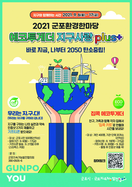 ±âÈĺ¯È·Î ÀÎÇÑ Åº¼ÒÁ߸³ÀÇ Çʿ伺ÀÌ Ä¿Áö°í ÀÖ´Â °¡¿îµ¥, ±ºÆ÷½Ã°¡ ±ºÆ÷ȯ°æÇѸ¶´ç ¡®¿¡ÄÚÅõ°Ô´õ Áö±¸»ç¶û plus+¡¯ Çà»ç¸¦ ÁøÇàÇϰí ÀÖ´Ù. ±ºÆ÷½Ã°¡ ±ºÆ÷Áö¼Ó°¡´É¹ßÀüÇùÀÇȸ¿Í ÇÔ²² ¿Â¶óÀÎÀ¸·Î ÁøÇàÇÏ´Â À̹ø Çà»ç´Â ±âÈĺ¯È À§±âÀÇ ½É°¢¼º°ú ´ëÀÀÀÇ Çʿ伺À» ±ú´Ý°í ź¼ÒÁ߸³ÀÇ »ýȰ ¼Ó ½ÇõÀ» ¸ð»öÇϱâ À§ÇØ ¸¶·ÃµÆ´Ù. 9¿ù 17ÀϱîÁö ¡®¿ì¸®´Â Áö±¸´Ù¡¯(¿ì¸®´Â Áö±¸¸¦ ±¸ÇÏ·¯ °©´Ï´Ù)¸¦ ÁÖÁ¦·Î °ü³» ½Ã¹Î 500¸í(¼±Âø¼ø)À¸·ÎºÎÅÍ ¿Ã¹Ù¸¥ ºÐ¸®¹èÃâ°ú ÀçȰ¿ë, ÀýÀü µî ½Çõ ¸ð½ÀÀ» ´ãÀº ÀÎÁõ¼¦ 2°³¸¦ QRÄڵ带 ÀÌ¿ëÇØ Á¦Ãâ¹ÞÀ» ¿¹Á¤À̸ç, Âü¿©Àڵ鿡°Ô´Â ±âÇÁƼÄÜÀ» ÁõÁ¤ÇÑ´Ù. ¶ÇÇÑ ¡®ÁýÄÛ ¿¡ÄÚÅõ°Ô´õ¡¯´Â 9¿ù 17ÀϱîÁö ±ºÆ÷½Ã °ÅÁÖÀÚ³ª Á÷ÀåÀÎ µîÀÌ ¾²·¹±â ¹ß»ý Á¦·Î¿Í ÀçȰ¿ë »óǰ ¸¸µé±â ¿îµ¿ÀÎ Á¦·Î¿þÀ̽ºÆ®, ½ÅÀç»ý¿¡³ÊÁö µî°ú °ü·ÃÇÑ ´Ù¾çÇÑ Ã¼ÇèŰƮ¸¦ Á÷Á¢ ¸¸µé¾îº¸°í ÀÎÁõ¼¦À» QRÄڵ带 ÅëÇØ Á¦ÃâÇÏ´Â ³»¿ëÀÌ´Ù. ±ºÆ÷½Ã´Â ÀÌ¿¡ ¾Õ¼ ½Ã °ÅÁÖÀÚ¿Í Á÷ÀåÀÎ, ´Üü µî 700¸í¿¡°Ô ¾÷»çÀÌŬ¸µ ¿ìÀ¯ÆÑ°ú ž籤ÀÚµ¿Â÷, Á¦·Î¿þÀ̽ºÆ® ¹°Ç° µîÀ» ´ãÀº üÇèŰƮ¸¦ Á¦°øÇß´Ù. ÀÚ¼¼ÇÑ ³»¿ëÀº ±ºÆ÷½Ã ȯ°æ°ú(031-390-0249)³ª ±ºÆ÷Áö¼Ó°¡´É¹ßÀüÇùÀÇȸ(031-390-0505)·Î ¹®ÀÇÇÏ¸é ¾È³»¹ÞÀ» ¼ö ÀÖ´Ù. ÇÑ´ëÈñ ±ºÆ÷½ÃÀåÀº ¡°±âÈĺ¯ÈÀÇ ½É°¢¼ºÀÌ ³ª³¯ÀÌ Áõ°¡Çϰí ÀÖ´Â »óȲ¿¡¼ ±× ´ëÀÀÃ¥À¸·Î ź¼ÒÁ߸³ÀÇ Çʿ伺µµ ³ô¾ÆÁö°í ÀÖ´Ù¡±¸ç, ¡°À̹ø Çà»ç°¡ ½Ã¹Îµé²²¼ ź¼ÒÁ߸³À» Á÷Á¢ ½ÇÃµÇØº¸´Â Â÷¿øÀÎ ¸¸Å, Å« ÀÇ¹Ì¿Í º¸¶÷À» ´À³¥ ¼ö ÀÖÀ» °Í¡±À̶ó°í ¸»Çß´Ù.