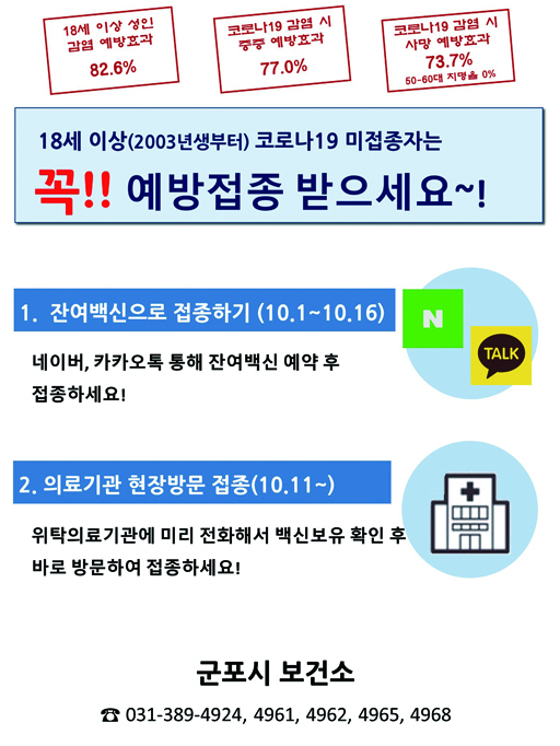 ±ºÆ÷½Ã´Â 10¿ù 12ÀÏ Äڷγª19 4Â÷ ´ëÀ¯Çà Àå±âÈ ¹× µ¨Å¸º¯ÀÌ È®»ê µîÀ¸·Î ¹é½ÅÁ¢Á¾ÀÇ Çʿ伺ÀÌ ÇÑÃþ Ä¿Áö°í ÀÖ´Ù¸ç, 18¼¼ ÀÌ»ó ¹ÌÁ¢Á¾ ½Ã¹ÎµéÀÇ Á¶¼ÓÇÑ Á¢Á¾À» ´çºÎÇß´Ù. 18¼¼ ÀÌ»ó ±ºÆ÷½Ã¹ÎµéÀÇ Á¢Á¾À²Àº 90.9%¿¡ À̸£°í ÀÖÀ¸³ª, ¹ÌÁ¢Á¾ÀÚÀÇ ¹é½Å Á¢Á¾ »çÀü¿¹¾àÀ²Àº Áö³ 9¿ù 30ÀÏ ±âÁØÀ¸·Î 7.2%·Î Àü±¹ Æò±Õ 8.9%¿¡ ºñÇØ ³·Àº ¼öÁØÀÌ´Ù. Á¢Á¾ ¹æ¹ýÀº µÎ °¡Áö·Î 10¿ù 16ÀϱîÁö ³×À̹ö¿Í īī¿À¸¦ ÀÌ¿ëÇØ ÀÜ¿©¹é½Å ¿¹¾àÀ» ÇÑ ÈÄ Á¢Á¾¹ÞÀ» ¼ö ÀÖÀ¸¸ç, 10¿ù 11ÀϺÎÅÍ´Â »çÀü¿¹¾à¾øÀÌ À§Å¹ÀÇ·á±â°ü¿¡ ¹®ÀÇÇØ ¹é½ÅÀÌ ÀÖÀ» °æ¿ì ¹Ù·Î ¹æ¹®Çؼ Á¢Á¾¹ÞÀ» ¼ö ÀÖ´Ù. ¹é½ÅÀº mRNA(¸ð´õ³ª)À̸ç, ¼ö±Þ»óȲ¿¡ µû¶ó º¯°æµÉ ¼ö ÀÖ´Ù. ÀÚ¼¼ÇÑ ³»¿ëÀº ±ºÆ÷½Ã º¸°Ç¼Ò(031-389-4924/4961/4962/4965/4968)·Î ¹®ÀÇÇÏ¸é ¾È³»¹ÞÀ» ¼ö ÀÖ´Ù. ±ºÆ÷½Ã °ü°èÀÚ´Â ¡°¹é½Å Á¢Á¾À» ¹ÞÀ» °æ¿ì 18¼¼ ÀÌ»ó ¼ºÀÎÀÇ Äڷγª19 °¨¿° ¿¹¹æÈ¿°ú°¡ 82.6%, Äڷγª19 °¨¿°½Ã ÁßÁõ ¿¹¹æÈ¿°ú´Â 77%, »ç¸Á ¿¹¹æÈ¿°ú´Â 73.3%¿¡ À̸¥´Ù.¡±¸ç, ¡°Äڷγª19 È®»ê ¹æÁö¿Í ÁßÁõ, »ç¸Á ¿¹¹æÀ» À§ÇØ 18¼¼ ÀÌ»ó ¹ÌÁ¢Á¾ ½Ã¹ÎµéÀº Á¶¼ÓÈ÷ ¹é½ÅÁ¢Á¾À» ¹Þ¾Æ´Þ¶ó.¡±°í ´çºÎÇß´Ù.