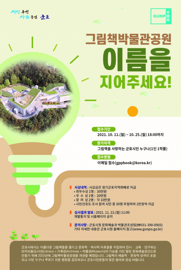 ±ºÆ÷½Ã°¡ ¡®±×¸²Ã¥¹Ú¹°°ü°ø¿ø¡¯ÀÇ ¸íĪÀ» °ø¸ðÇÑ´Ù. À̹ø °ø¸ðÀüÀº 2022³â ÇϹݱ⠳» °³°ü ¿¹Á¤ÀÎ ±×¸²Ã¥¹Ú¹°°ü°ø¿øÀÇ °ø½Ä ¸íĪ ¼±Á¤¿¡ ½Ã¹ÎµéÀÇ ÀǰßÀ» ¹Ý¿µÇϱâ À§ÇØ ¸¶·ÃµÆ´Ù. °ø¸ð Âü¿©´Â ±ºÆ÷½Ã ȨÆäÀÌÁö ¿¸°½ÃÁ¤ »õ¼Ò½Ä Äڳʸ¦ Âü°íÇØ Á¦¾È¼¸¦ ÀÛ¼ºÇÑ ÈÄ, 10¿ù 25ÀϱîÁö À̸ÞÀÏ(gppbook@korea.kr)·Î Á¢¼öÇÏ¸é µÈ´Ù. ÀÚ¼¼ÇÑ ³»¿ëÀº ±ºÆ÷½Ã ¹®È¿¹¼ú°ú(031-390-0903)·Î ¹®ÀÇÇÏ¸é ¾È³»¹ÞÀ» ¼ö ÀÖ´Ù. ½É»ç±âÁØÀº ±×¸²Ã¥¹Ú¹°°ü°ø¿øÀÇ Á¤Ã¼¼º°ú ¼º°Ý, ±×¸²Ã¥ÀÇ ¿¹¼úÀûÀÌ°í ¹®ÈÀûÀΠƯ¡ µîÀ» µ¶Ã¢ÀûÀ¸·Î Ç¥ÇöÇÏ°í ´©±¸³ª ºÎ¸£±â ½±°í Ä£±Ù°¨À» ÁÙ ¼ö ÀÖ´Â ¸íĪÀÌ´Ù. ½Ã»óÀº ÃÖ¿ì¼ö»ó 1¸í¿¡ ½Ã»ó±Ý 30¸¸¿ø, ¿ì¼ö»ó 1¸í¿¡ 20¸¸¿ø, Àå·Á»ó 2¸í¿¡ °¢°¢ 10¸¸¿ø¾¿À» ±ºÆ÷Áö¿ªÈÆóÀÎ ¡®±ºÆ÷äñ¸Ó´Ï¡¯·Î Áö±ÞÇϸç, °ø¸ðÀü °¡¿îµ¥ ½Ã¹Î¼±È£µµ Á¶»ç¿¡ Âü¿©ÇÑ ½Ã¹Î 30¸íÀ» ÃßÃ·ÇØ¼ 1¸¸¿ø¾¿À» ¡®±ºÆ÷äñ¸Ó´Ï¡¯·Î Áö±ÞÇÒ ¿¹Á¤ÀÌ´Ù.±º