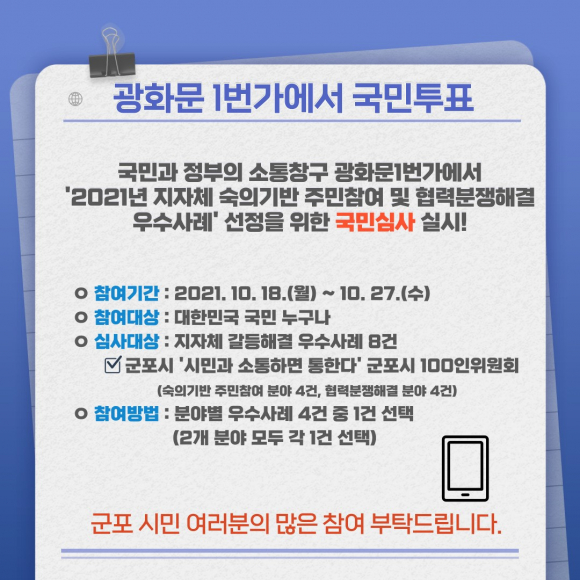 ±ºÆ÷½Ã´Â 10¿ù 20ÀÏ ÇàÁ¤¾ÈÀüºÎ ÁÖ°ü ¡®ÁöÀÚü ¼÷ÀDZâ¹Ý ÁÖ¹ÎÂü¿© ¹× Çù·Â¡¤ºÐÀïÇØ°á ¿ì¼ö»ç·Ê °æÁø´ëȸ¡¯ ¼÷ÀDZâ¹Ý ÁÖ¹ÎÂü¿© ºÐ¾ß¿¡¼, 100ÀÎ À§¿øÈ¸ÀÇ ¡®½Ã¹Î°ú ¼ÒÅëÇϸé ÅëÇÑ´Ù¡¯°¡ ÁöÀÚü 4°÷À¸·Î ¾ÐÃàµÈ ÃÖÁ¾ 4°¿¡ ÁøÃâÇß´Ù°í ¹àÇû´Ù. 4° ÁøÃâ ÁöÀÚü´Â ´ë±¸±¤¿ª½Ã¿Í ±ºÆ÷½Ã, ÀüÁÖ½Ã, ¿Ïµµ±ºÀ̸ç, ÀÌ·Î½á ±ºÆ÷½Ã´Â ÃÖ¼ÒÇÑ Àå·Á»óÀ» È®º¸Çß´Ù. À̾î 4° ÁöÀÚüµéÀ» »ó´ë·Î ±¹¹Î½É»ç°¡ ÁøÇàµÇ´Âµ¥, 10¿ù 27ÀϱîÁö ´ëÇѹα¹ ±¹¹Î ´©±¸³ª ±¤È¹®1¹ø°¡ ´©¸®Áý(www.gwanghwamoon1st.go.kr)¿¡ Á¢¼ÓÇØ ÅõÇ¥ÇÒ ¼ö ÀÖÀ¸¸ç, ÃÖÁ¾ ¹ßǥȸ´Â 10¿ù 29ÀÏ Çà¾ÈºÎ Á¦1º°°ü¿¡¼ ¿¸°´Ù. ÃÖÁ¾¹ßǥȸ¸¦ °ÅÃÄ ÃÖ¿ì¼ö»ó°ú ¿ì¼ö»ó, Àå·Á»ó 2°³ ÁöÀÚü°¡ È®Á¤µÈ´Ù. ±ºÆ÷½Ã 100ÀÎ À§¿øÈ¸ÀÇ ¡®½Ã¹Î°ú ¼ÒÅëÇϸé ÅëÇÑ´Ù¡¯´Â ÀÌÇØ´ç»çÀÚ¿Í ÁֹεéÀÇ ÀǰßÀ» ¼ö·ÅÇØ °¥µî ¿äÀÎÀ» »çÀü¿¡ Á¦°ÅÇÏ´Â µî, Âü¿©¹ÎÁÖÁÖÀÇÀÇ ÇÑ ¸ðµ¨ÀÎ ¼÷ÀǹÎÁÖÁÖÀǸ¦ Ȱ¿ëÇØ¼ Á¤Ã¥°áÁ¤°ú »ç¾÷ÃßÁø°úÁ¤¿¡ ´ç»çÀÚÀÇ ÀǰßÀ» Æø³Ð°Ô µè´Âµ¥ ÁÖ¾ÈÁ¡À» µÎ°í ÀÖ´Ù. ±ºÆ÷½Ã °ü°èÀÚ´Â ¡°ÁÖ¹ÎÂü¿©Çü ¼÷ÀDZâ¹Ý½Ã½ºÅÛ ±ºÆ÷½Ã 100ÀÎ À§¿øÈ¸¸¦ ÅëÇØ ½Ã¹Î¿ì¼± »ç¶÷Á᫐ ±ºÆ÷½ÃÀÇ Áֹμ¶±è ½ÃÁ¤ÀÌ ÁÁÀº ¼º°ú¸¦ °ÅµÑ ¼ö ÀÖµµ·Ï ½Ã¹Îµé°ú °ü½ÉÀÖ´Â ±¹¹ÎµéÀÇ ¸¹Àº ÀÀ¿øÀ» ¹Ù¶õ´Ù.¡±°í ¸»Çß´Ù. |