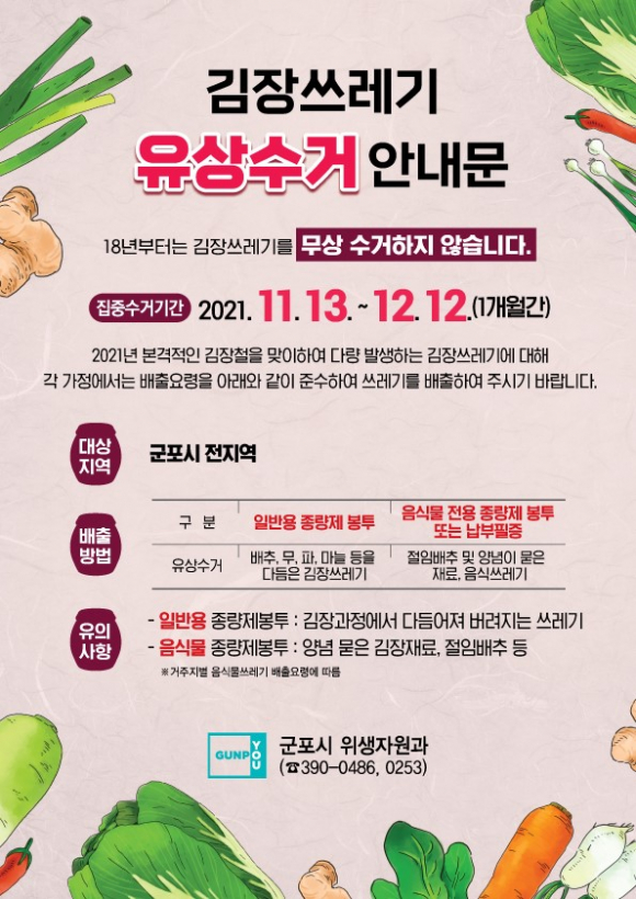 ±ºÆ÷½Ã´Â 11¿ù 2ÀÏ °Ü¿ïö ±èÀå¾²·¹±â´Â À¯»óÀ¸·Î ¼ö°ÅÇÑ´Ù¸ç ½Ã¹ÎµéÀÇ ÁÖÀÇ¿Í ÇùÁ¶¸¦ ´çºÎÇß´Ù. ±ºÆ÷½Ã´Â Áö³ 2018³âºÎÅÍ ±èÀå¾²·¹±â À¯»ó¼ö°Å¸¦ ½Ç½ÃÇϰí ÀÖÀ¸¸ç, ÀÌ¿¡ µû¶ó ¿ÃÇØ ±èÀå¿¡¼µµ ¹èÃß, ¹«, ÆÄ µîÀ» ´Ùµë°í ³²Àº ¾²·¹±â´Â ÀϹݿë Á¾·®Á¦ ºÀÅõ¿¡ ³Ö¾î¼ ¹èÃâÇØ¾ß ÇÑ´Ù. ¶ÇÇÑ ¾ç³ä¹¯Àº ±èÀåÀç·á¿Í ÀýÀÓ ¹èÃß µîÀº À½½Ä¹° Àü¿ë Á¾·®Á¦ ºÀÅõ¿¡ ³Ö¾î ¹èÃâÇØ¾ß ÇÑ´Ù. ±ºÆ÷½Ã´Â 11¿ù 13ÀϺÎÅÍ 12¿ù 12ÀϱîÁö 1°³¿ùÀ» ±èÀå¾²·¹±â ÁýÁß À¯»ó¼ö°Å ±â°£À¸·Î Á¤Çϰí, °¢ µ¿ ÇàÁ¤º¹Áö¼¾ÅÍ¿Í ¹Ý»óȸ µîÀ» ÅëÇØ À¯»ó¼ö°Å¸¦ Àû±ØÀûÀ¸·Î È«º¸ÇÒ ¿¹Á¤ÀÌ´Ù. ÀÚ¼¼ÇÑ ³»¿ëÀº ±ºÆ÷½Ã À§»ýÀÚ¿ø°ú(031-390-0486)·Î ¹®ÀÇÇÏ¸é ¾È³»¹ÞÀ» ¼ö ÀÖ´Ù. ±ºÆ÷½Ã °ü°èÀÚ´Â ¡°±èÀåÀç·á Àý¾à°ú ȯ°æ º¸È£¸¦ À§ÇØ À¯»ó¼ö°Å¸¦ Çϰí ÀÖ´Â ¸¸Å, ½Ã¹ÎµéÀÇ ÁÖÀÇ¿Í ÇùÁ¶¸¦ ´çºÎµå¸°´Ù.¡±°í ¸»Çß´Ù. |