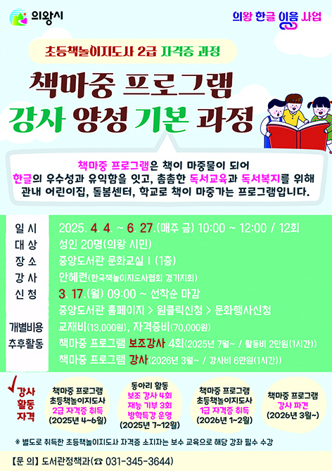 ÀǿսÃ(½ÃÀå ±è¼ºÁ¦)´Â ¡¸ÀÇ¿Õ ÇÑ±Û ÀÌÀ½ »ç¾÷¡¹ÀÇ ÀÏȯÀ¸·Î ¹Î¡¤°ü¡¤ÇÐ Çù·Â ¡®(ã¾Æ°¡´Â µµ¼°ü) Ã¥¸¶Áß ÇÁ·Î±×·¥ °»ç ¾ç¼º °úÁ¤¡¯À» ¿î¿µÇÑ´Ù°í ¹àÇû´Ù. Áö³ÇغÎÅÍ ÃßÁø µÈ Àǿսà 帶Áß ÇÁ·Î±×·¥Àº ¾î¸°ÀÌÁý, µ¹º½¼¾ÅÍ, Çб³, º¹Áö°ü µî°ú Çù·ÂÇÏ¿© Çѱۡ¤µ¶¼ ¹®È ÇÁ·Î±×·¥À» Áö¿øÇÏ´Â »ç¾÷À¸·Î À¯¾Æ, ¾î¸°ÀÌ, û¼Ò³â, ¼ºÀÎ, ³ëÀαîÁö Àü »ý¾Ö¸¦ ¾Æ¿ï·¯ µ¶¼ ±â¹Ý ÇÑ±Û ¹®È È®»ê¿¡ ±â¿©Çϰí ÀÖ´Ù. 2025³â¿¡´Â ¡â3°³ ¾î¸°ÀÌÁý ¡â3°³ µ¹º½¼¾ÅÍ ¡â9°³ ÃʵîÇб³ ¡â2°³ ÁßÇб³ ¡â1°³ º¹Áö°ü µî ÃÑ 18°³ ±â°üÀÇ Çù·Â»ç¾÷À¸·Î ÃßÁøµÈ´Ù. Àǿսÿ¡¼´Â Ã¥¸¶Áß »ç¾÷ÀÇ ¼º°øÀûÀÎ ÃßÁøÀ» À§ÇØ ÇÁ·Î±×·¥ ¿î¿µ °»ç¸¦ Á÷Á¢ ¾ç¼ºÇϸç, À̹ø¡®Ã¥¸¶Áß ÇÁ·Î±×·¥ °»ç ¾ç¼º ±âº» °úÁ¤(ÃʵîÃ¥³îÀÌÁöµµ»ç 2±Þ ÀÚ°ÝÁõ °úÁ¤)¡¯À» ÅëÇØ ½Ã¹Î µ¶¼Àü¹®°¡¸¦ ¸¸µç´Ù´Â °èȹÀÌ´Ù. ±³À° °úÁ¤Àº Áß¾Óµµ¼°ü¿¡¼ 4¿ù 4ÀϺÎÅÍ 6¿ù 27ÀϱîÁö ¸ÅÁÖ ±Ý¿äÀÏ 12ȸ °úÁ¤À¸·Î ÁøÇàµÇ¸ç, ÇϹݱ⿡´Â µ¿¾Æ¸® Ȱµ¿°ú Ã¥¸¶Áß ÇÁ·Î±×·¥ º¸Á¶°»ç 4ȸ, Àç´É±âºÎ 3ȸ, ¹æÇРƯ° ¿î¿µ µî ±³À°»ýµéÀÇ ¿ª·®À» ¹ßÈÖÇÒ ¼ö ÀÖ´Â ´Ù¾çÇÑ ½Ç½À ±âȸµµ Á¦°øÇÒ ¿¹Á¤ÀÌ´Ù. ¶ÇÇÑ, ±âº» °úÁ¤À» ¸¶Ä£ Âü°¡ÀÚ°¡ 2026³â 1~2¿ù ½ÉÈ °úÁ¤±îÁö Âü¿©ÇØ ÃʵîÃ¥³îÀÌÁöµµ»ç 1±Þ ÀÚ°ÝÁõÀ» ÃëµæÇÏ¸é ³»³âµµ 3¿ùºÎÅÍ Ã¥¸¶Áß ÇÁ·Î±×·¥ °»ç·Î Á¤½Ä Ȱµ¿ÇÒ ¼ö ÀÖ°Ô µÈ´Ù. À̹ø °úÁ¤ ½ÅûÀº 3¿ù 17ÀÏ ¿ù¿äÀÏ ¿ÀÀü 9½ÃºÎÅÍ ÀǿսÃÁß¾Óµµ¼°ü ȨÆäÀÌÁö¿Í ¸®ºê·ÎÇÇ¾Æ ¾îÇÃÀ» ÅëÇØ °¡´ÉÇÏ´Ù. ÀÚ¼¼ÇÑ »çÇ×Àº µµ¼°üÁ¤Ã¥°ú µµ¼°üÁ¤Ã¥ÆÀ(¢Ï031-345-3644)À¸·Î ¹®ÀÇÇÏ¸é ¾È³»¹ÞÀ» ¼ö ÀÖ´Ù. ¼ÛÀº¾Æ µµ¼°üÁ¤Ã¥°úÀåÀº¡°À̹ø Ã¥¸¶Áß ÇÁ·Î±×·¥ °»ç ¾ç¼º °úÁ¤À» ÅëÇØ Çѱ۹®È º¹Áö¸¦ ½ÇÇöÀ» À§ÇÑ È°µ¿°¡°¡ ¾ç¼ºµÇ°í, ½Ã¹ÎµéÀÌ ÇÔ²² ¼ºÀåÇØ °¡´Â ÁÁÀº °è±â°¡ µÇ±â¸¦ ¹Ù¶õ´Ù.¡±°í ¸»Çß´Ù. |