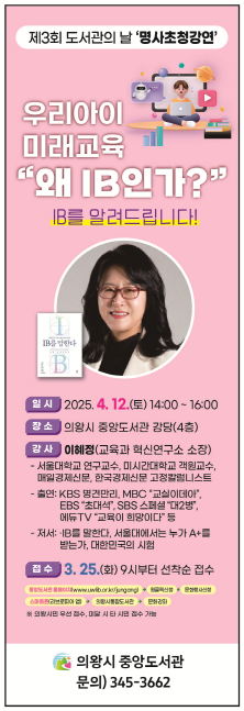 Àǿսà Áß¾Óµµ¼°üÀº IB ±³À° Àü¹®°¡ÀÎ ÀÌÇýÁ¤ ¼ÒÀå(±³À°°úÇõ½Å¿¬±¸¼Ò)À» ÃÊÃ»ÇØ IB ±³À°ÀÇ ¹Ì·¡¸¦ °øÀ¯ÇÏ´Â ½Ã°£À» °®´Â´Ù. À̹ø Ư°Àº Áö³ 3¿ù, Àü±¹ ÃÖÃÊ·Î IB±³À° °úÁ¤À» µµÀÔÇÑ Áß․°í ÅëÇÕ Æ¯¼ºÈ Çб³ÀÎ ³»¼ÕÁß°íµîÇб³ÀÇ °³±³¿¡ ¹ß ¸ÂÃß¾î ¸¶·ÃµÆ´Ù. 4¿ù 12ÀÏ Àǿսà Áß¾Óµµ¼°ü 4Ãþ °´ç¿¡¼ ¿ÀÈÄ 2½ÃºÎÅÍ ÁøÇàµÇ´Â Ư°Àº Çлý¡¤Çкθð µî °ü½ÉÀÖ´Â ´©±¸³ª Âü¿©ÇÒ ¼ö ÀÖÀ¸¸ç, 25ÀϺÎÅÍ Áß¾Óµµ¼°ü ȨÆäÀÌÁö(¿øÅ¬¸¯½Åû – ¹®ÈÇà»ç½Åû)¸¦ ÅëÇØ ½ÅûÇÏ¸é µÈ´Ù.