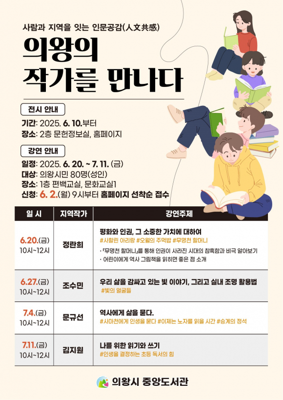 ÀǿսÃ(½ÃÀå ±è¼ºÁ¦) Áß¾Óµµ¼°üÀº ½Ã¹ÎµéÀ» ´ë»óÀ¸·Î¡®ÀÇ¿ÕÀÇ Áö¿ªÀÛ°¡¸¦ ¸¸³ª´Ù¡¯ ¸±·¹ÀÌ °¿¬ ¹× Àü½Ã¸¦ °³ÃÖÇÑ´Ù. À̹ø Çà»ç´Â ´Ù¾çÇÑ ºÎ¹®¿¡¼ ÀÛ°¡ÀÇ Ã¢ÀÛ °æÇè°ú ÀÛǰ À̾߱⸦ ÀüÇØ µè°í, Áö¿ªÀÇ ÀÛ°¡¿Í ½Ã¹Î°úÀÇ Æ¯º°ÇÑ ¸¸³²À» ÅëÇØ °ÇÀüÇÑ Áö¿ª ¹®ÇÐ »ýŰè Á¶¼ºÀ» À§ÇØ ÃßÁøµÆ´Ù. 6¿ù 10ÀϺÎÅÍ ÁøÇàµÈ Áö¿ª ÀÛ°¡ÀÇ µµ¼ Àü½Ã(109±Ç)¸¦ ½ÃÀÛÀ¸·Î ¡ã6/20(±Ý) Á¤¶õÈñ ÀÛ°¡ÀÇ ¡°ÆòÈ¿Í ÀαÇ, ±× ¼ÒÁßÇÑ °¡Ä¡¿¡ ´ëÇÏ¿©¡±¡ã 6/27(±Ý) Á¶¼ö¹Î ÀÛ°¡ÀÇ ¡°¿ì¸® »îÀ» °¨½Î°í ÀÖ´Â ºû À̾߱â, ±×¸®°í ½Ç³» Á¶¸í Ȱ¿ë¹ý¡±¡ã7/4(±Ý) ¹®±Ô¼± ÀÛ°¡ÀÇ ¡°¿ª»ç¿¡°Ô »îÀ» ¹¯´Ù¡±¡ã 7/11(±Ý) ±èÁö¿ø ÀÛ°¡¡°³ª¸¦ À§ÇÑ Àбâ¿Í ¾²±â¡±°¿¬È¸°¡ °¢°¢ À̾îÁø´Ù. À̹ø ÇÁ·Î±×·¥ÀÇ ½ÅûÀº Áß¾Óµµ¼°ü ȨÆäÀÌÁö(uwlib.or.kr/jungang, ¿øÅ¬¸¯½Åû – ¹®ÈÇà»ç½Åû)¿¡¼ ¼±Âø¼øÀ¸·Î ÁøÇàµÇ¸ç, µµ¼°ü ȸ¿øÀ¸·Î °¡ÀÔÇÏ¸é ¸Å¿ù ´Ù¾çÇÑ µ¶¼ ¹®È Á¤º¸¸¦ Á¦°ø¹ÞÀ» ¼ö ÀÖ´Ù. |